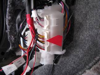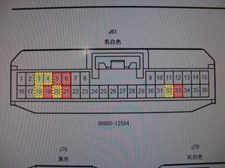 運転席側(ビルトインETCのあるパネル奥)スマートキーCPに刺さっているJ61カプラを見ると助手席用のスマートエントリー配線が空席状態(下図の赤番号)です。ちなみに黄色番号は運転席用のスマート配線です。これはもしかすると、ここに繋げばG仕様のスマート化が出来るかも知れないと淡い期待をしながら作業スタート。 J61カプラに簡易配線(被服を剥いてカプラに差し込む方法)し、助手席側まで5本の配線を這わして助手席足元(左カバー内)のMJ1カプラと繋ぎ(ここはハンダ止め)ました。 |
