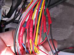 下手くそですが、ハンダ止めしました。 カッターナイフで被覆を削り中の線が少しでも見えれば、 後はハンダの熱で被覆は溶けてくっつきます。 分岐コネクタは配線を切断する恐れがあるため、使わないようにしています。 |