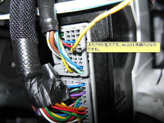 助手席グローブボックスを外すとCPが出てきます。左の灰色カプラ4つの内、一番上がJ5カプラです。これのNO.22にリペアワイヤを差込みます。(黄色線)ギボシから赤線で延長し、黒色J47カプラと結線します。 |